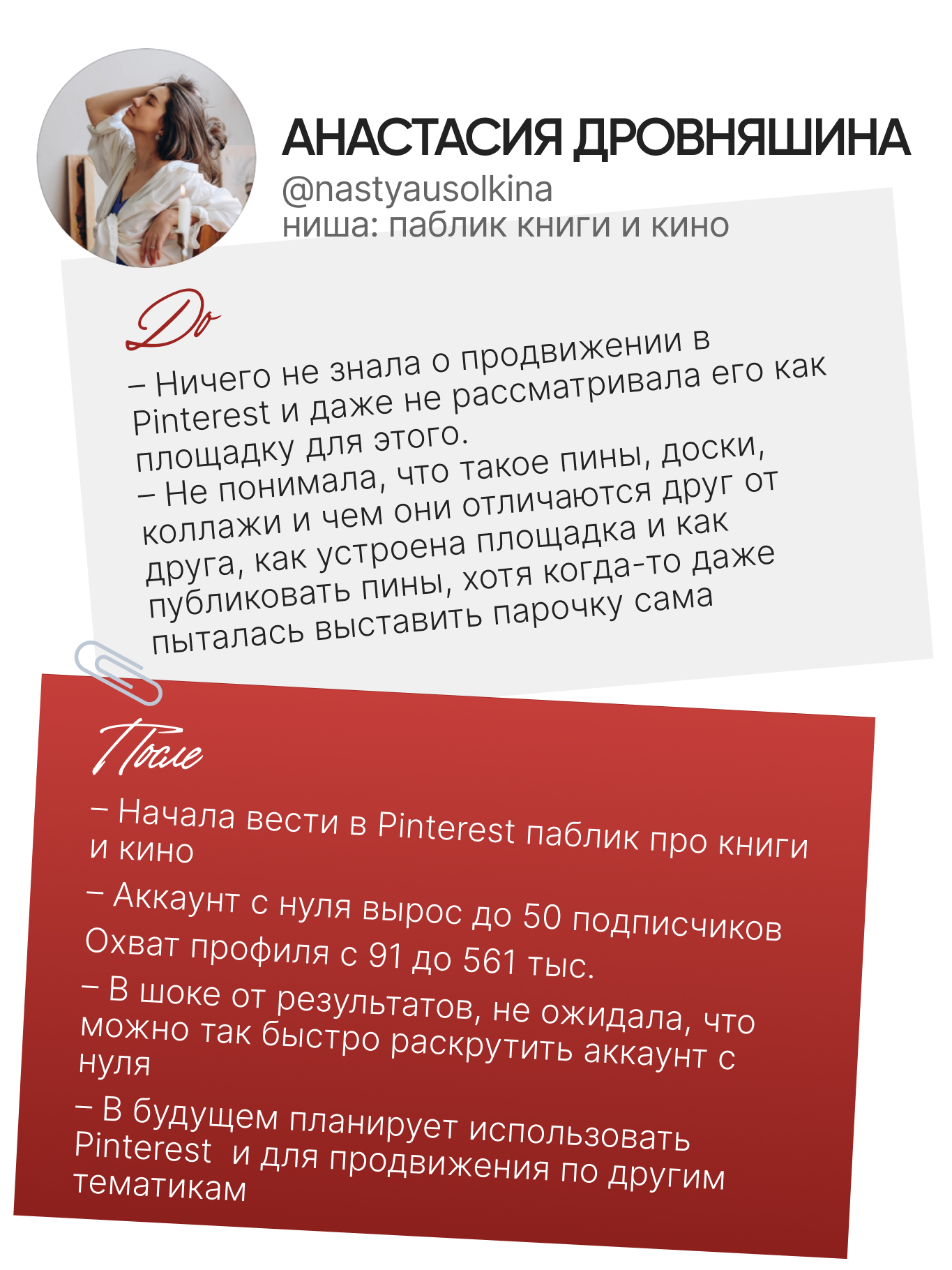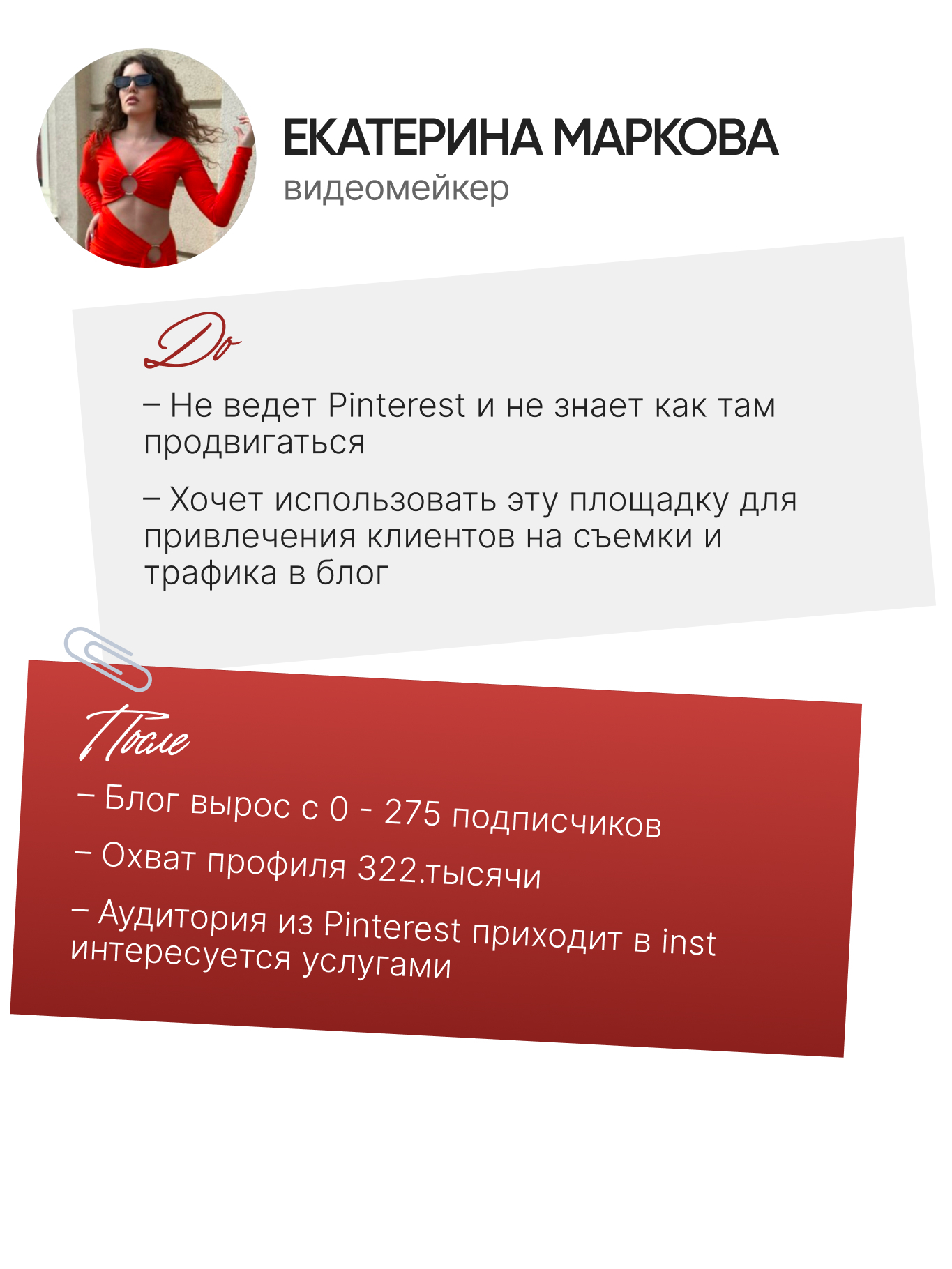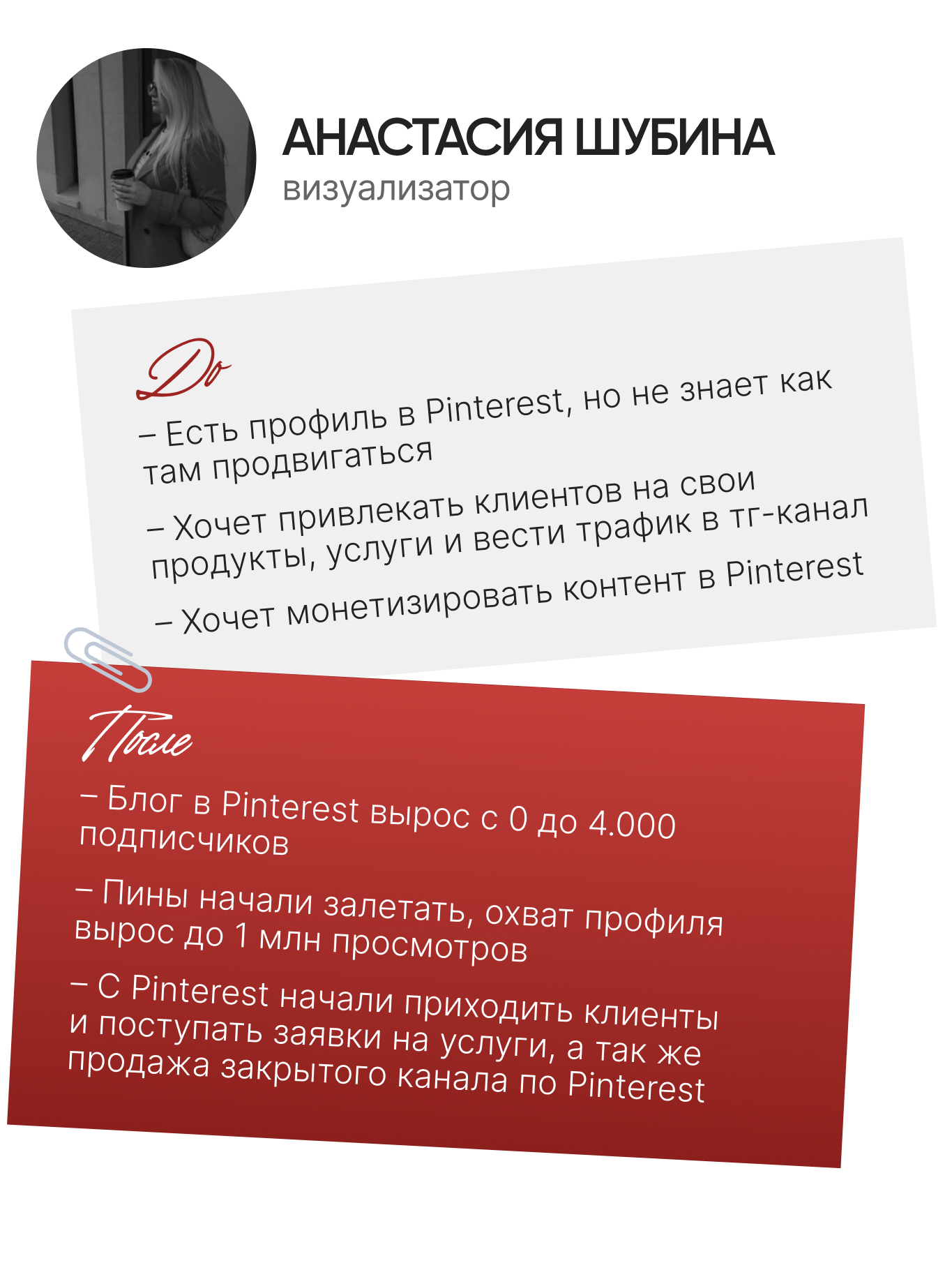Вы поймёте, как переводить аудиторию из Pinterest в другие социальные сети (инст, тг, YouTube) и площадки: сайты, маркетплэйсы. Разработаете свою индивидуальную стратегию продвижения.